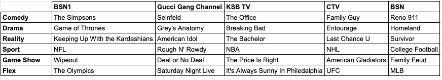 The regular crew return to draft TV shows for their own personal channels. Korean Super Boy TV, Cameron TV (CTV), Blake Stepien Network (BSN1), Ben’s Superior Network (BSN) and the Gucci Gang Channel battle through 6 rounds to draft the best comedy, game show, reality tv show, sport, tv drama.