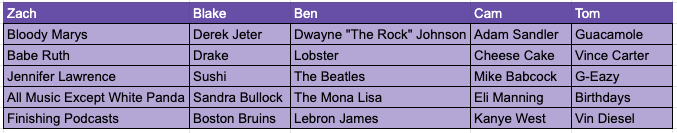 We then dive into our last fantasy draft: “Overrated Stuff”. In a five round snake draft each podcaster had to fill in each category: