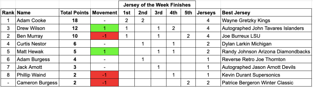 Adam remains firmly in first place with no signs of slowing down. Drew leapfrogs to second place with the top jersey this week.