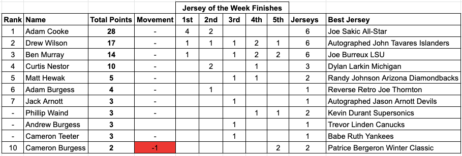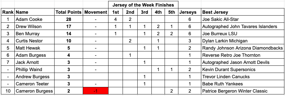 Adam continues to run up the score. The pundits have wondered if he’s a one trick pony. How many 90’s hockey jerseys could he possibly have left? On the other hand Ben by far has had the most diverse collection so far. Is his strategy built better for a long season?