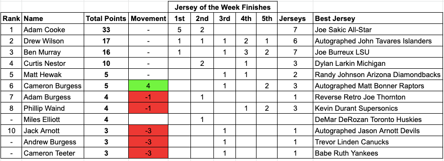 Jersey of the Week Standings